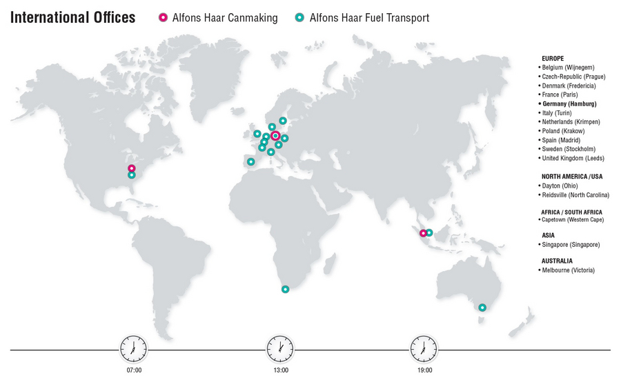 Mr. Alfons Haar founded Alfons Haar Maschinenbau GmbH & Co KG in Hamburg, Germany, in 1949 as a small, specialized machine manufacturer. Today, the second and third generations of family management lead a global group of companies. The company differentiates itself as an independent, family-owned global player for solutions in the logistics of fuels, liquefied gases, chemicals and granules as well as machinery and equipment for the can making industry. Our international direct sales and support network is continuously expanded by a professional management. |